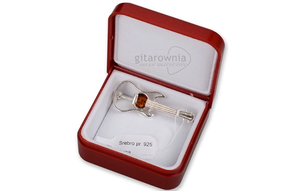 - Elegancka broszka w kształcie gitary elektrycznej. Próba srebra - 925, bursztyn naturalny. Długość broszki - 35 mm.