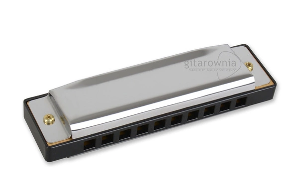 Harmonijka ustna w tonacji C, 10-kanałowa. Kolor srebrny. Grzebień: tworzywo ABS. Stroiki: stal nierdzewna.