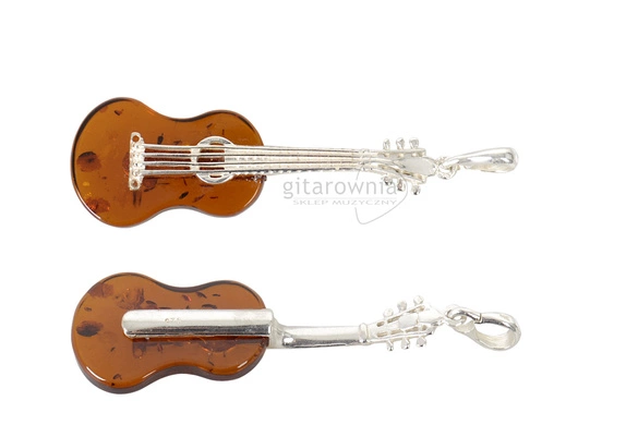 - Wisior w kształcie gitary klasycznej. Próba srebra - 925, bursztyn naturalny. Długość wisiora - 54 mm.