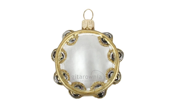 Ręcznie malowana bombka z dmuchanego szkła w kształcie tamburynu. Piękna ozdoba choinkowa, która powinna zagościć na twoim świątecznym drzewku.