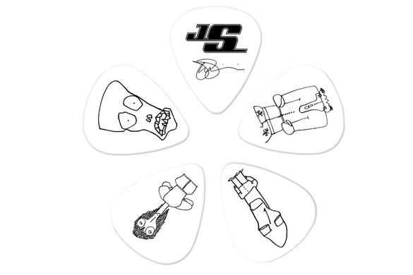 - Zestaw oryginalnych kostek gitarowych Joe Satriani z reprodukcjami jego osobistych rysunków. Opakowanie zawiera 10 sztuk. Rozmiar: medium.