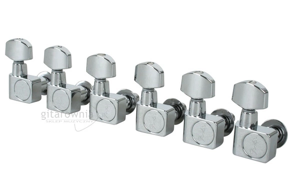 Komplet kluczy gitarowych marki Fender®, przełożenie 14:1, dwa piny (2 dłuższe, 4 krótsze). Klucze z dłuższymi trzpieniami stosowane są do niskich strun E i A a z krótszymi stosowanymi do strun D, G, B i wysokich E.