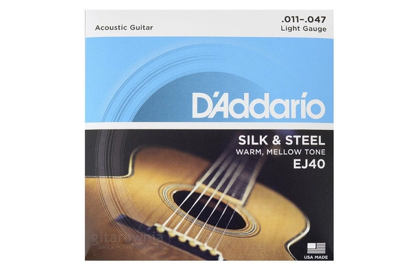 Struny D'Addario EJ40 do gitary akustycznej. Grubość strun 011 - 047 ( 011, 014, 023, 028, 038, 047 ). EJ40 to wyjątkowo lekki zestaw strun, idealny do gitar o małym korpusie oraz instrumentów vintage. Zestawy strun Silk & Steel łączą w sobie lekkość z łagodnym brzmieniem i są najlepszym wyborem wśród graczy folkowych.