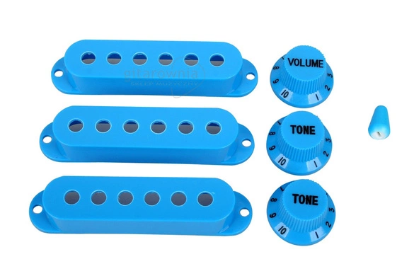 Zestaw coverów oraz gałek na potencjometry. Każda z osłon na przetwornik ma inny rozstaw nabiegunników!