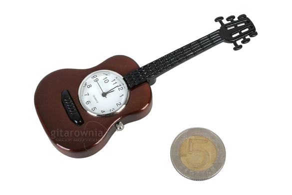 Miniatura gitary klasycznej z zegarkiem. Solidna, metalowa obudowa. Elegancka ozdoba do wnętrza, zwłaszcza dla muzyka.