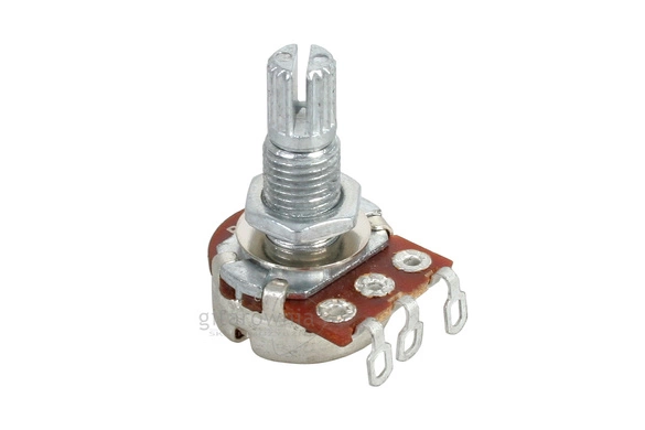 B250K 18 mm - liniowy potencjometr, najczęściej stosowany jako potencjometr barwy tonu w gitarach z przystawkami typu Single Coil (jednocewkowe). Jest to model z tzw "małą puszką" - 16.5mm średnicy. Wysokość trzpienia 18 mm.