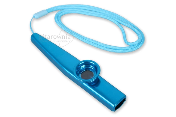 Oferowany model jest wykonany z metalu, kolor: lazurowy. Długość kazoo 12cm. Długość sznureczka - 39 cm.