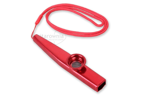 Oferowany model jest wykonany z metalu, kolor: odcień czerwieni. Długość kazoo 12cm. Długość sznureczka - 39 cm.