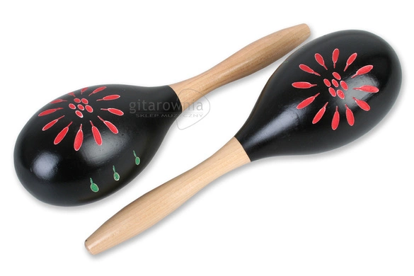 Marakasy w całości wykonane z drewna. Główka, w której znajduje się ziarno pokryta jest ciemnym lakierem. Na jej powierzchni wyryte zostały płytkie, małe ozdoby w różnych kolorach. Dzięki temu instrument jest okazały wizualnie i staje się oryginalny. Całość pokryta jest dodatkowo cienką warstwą bezbarwnego lakieru. Jest to instrument dla kogoś kto poszukuje ciekawych grzechotek, które będą się niewątpliwie wyróżniać spośród innych instrumentów oraz chce urozmaicić brzmienie swojej muzyki i rozbudować instrumentarium.