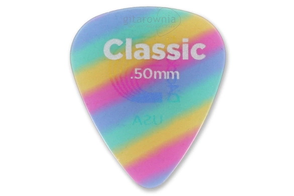 - Kostki gitarowe marki D'addario, wykonane z Celluloidu o grubości .50 mm. Kolor: rainbow, półprzezroczysta