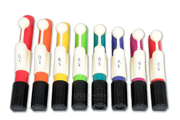 Oznaczenia dźwięków w postaci naklejek z wysokością dźwięku i zarazem koloru.