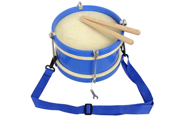 Bęben wykonany ze stali oraz sklejki, kolor niebieski. Naciąg ze sztucznej skóry.