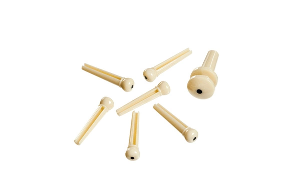 - Zestaw siedmiu kołków do gitary akustycznej wraz z 1 kołkiem na pasek (1 End Pin). Wykonane z wytrzymałego tworzywa ABS. Kolor - Ivory z czarną kropką.
