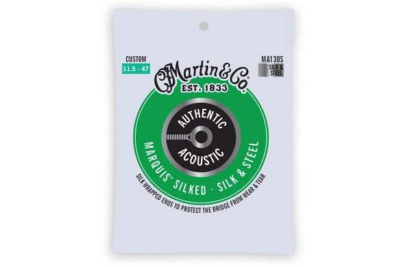Struny Martin® Authentic Acoustic® Marquis® Silked Silk & Steel .0115"-.047" posiadają miękką jedwabną owijkę, która zapobiega zużyciu otworów w mostku i płyty mostka podczas gry. Dodatkowa grubość zapewnia również, że kołki mostka pozostaną zablokowane w miejscu, nawet w starszych mostkach z wytartymi otworami. Nasze standardy brzmienia gitary akustycznej są osadzone w naszym projekcie strun i precyzyjnym procesie produkcji. Dlatego właśnie produkujemy nasze własne.