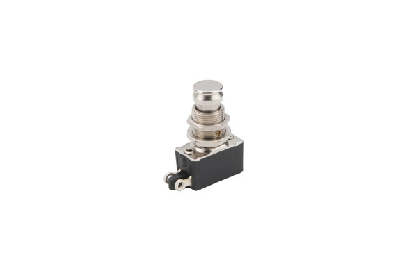 Przełącznik panelowy, SPST, chwilowy (momentary) "na klik", srebrne styki, nóżki do lutowania na przewód, "Made in Italy".