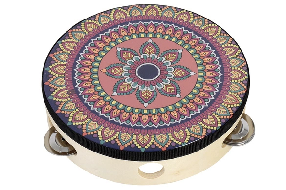 - Tamburyno z membraną, 10 blaszek w 5 otworach. Średnica 18 cm, wysokość 4,5 cm.