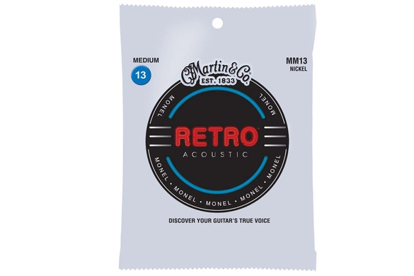 Struny do gitary akustycznej firmy Martin®, seria Retro®. Są one wykonane z rdzenia cynowano-stalowego owiniętego materiałem o nazwie Monel, specjalnego, opatentowanego drutu wykonanego ze stopu niklu i miedzi - drut nie jest powlekany niklem, co oznacza, że struny są naturalnie odporne na korozję i niesamowicie wytrzymałe. Wyrafinowany proces nawijania strun Retro® kontroluje sprzężenie między rdzeniem a drutem owijającym w celu zmaksymalizowania intonacji. W efekcie końcowym otrzymujemy struny w stylu retro (prawdziwa oferta z lat 30'), które dają łagodny i jednocześnie ostry dźwięk co sprawia, ze gitara brzmi naturalnie.
