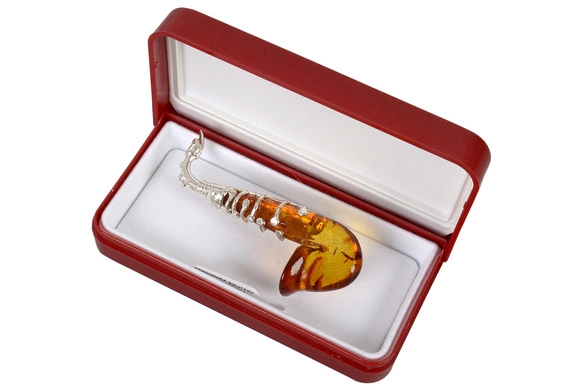 - Elegancka broszka w kształcie saksofonu. Próba srebra - 925, bursztyn naturalny. Wymiary - 52 x 21 mm.