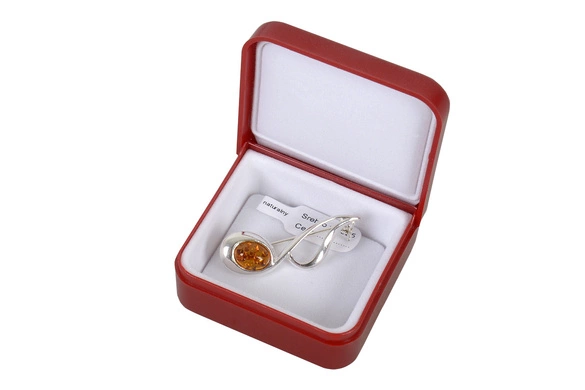 Próba srebra - 925, bursztyn naturalny. Wymiary broszki - 32 x 13 mm.