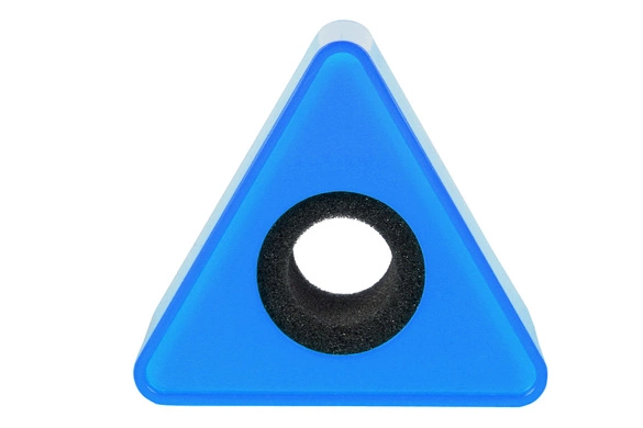 Kostka reklamowa trójkąt na mikrofon. Wykonana z tworzywa sztucznego, wewnątrz otworu pianka. Kolor niebieski.