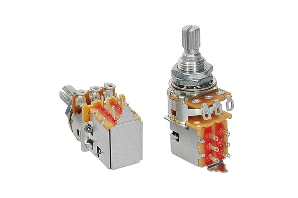 - Potencjometr typu push-pull. Mały - 18 mm. Logarytmiczny (głośność). 500kOhm. Najczęściej używany do przetworników typu humbucker. Umożliwia rozłączanie cewek. Wysokość całkowita - 44 mm. Wysokość gwintu - 10 mm. Średnica gwintu - 7 mm.