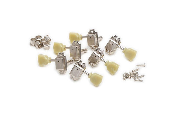 Komplet kluczy (maszynek, stroików) gitarowych marki Kluson. Model MC33N. Wykorzystują dwuczęściową obudowę dla dodatkowej wytrzymałości i precyzji.