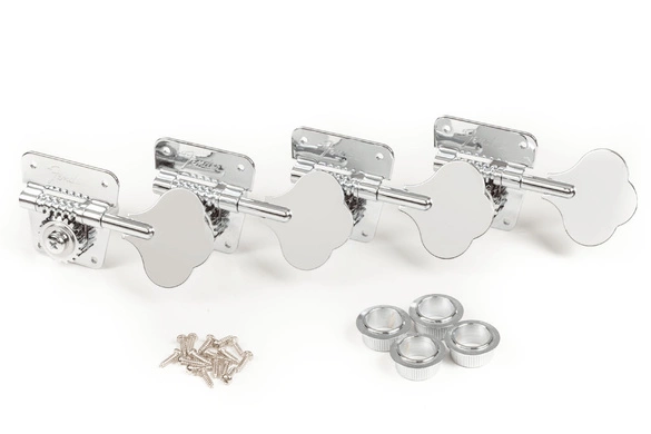 Zestaw czterech chromowanych kluczy (stroików) Pure Vintage z otwartą przekładnią w stylu "liścia koniczyny" ze śrubami montażowymi w zestawie. Logo "Fender" wytłoczone na każdej płytce stroika. Używany w basach American Vintage '74, '75 i American Original '70