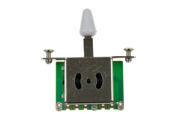 Przełącznik przystawek - 3 pozycyjny, ślizgowy. Najczęściej spotykany w gitarach wyposażonych w dwie przystawki / przetworniki. Model z główką w kolorze białym. Można go również zainstalować w gitarze z układem 3 przystawek, ale nie będziemy wtedy mieli możliwości uzyskania brzmienia wybranych dwóch jednocześnie, jak to ma miejsce w 2 i 4 pozycji przełącznika 5-pozycyjnego.