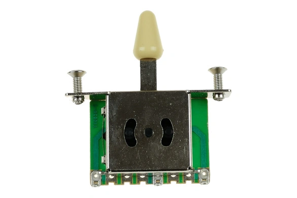 Przełącznik przystawek - 3 pozycyjny, ślizgowy. Najczęściej spotykany w gitarach wyposażonych w dwie przystawki / przetworniki. Model z główką w kolorze białym. Można go również zainstalować w gitarze z układem 3 przystawek, ale nie będziemy wtedy mieli możliwości uzyskania brzmienia wybranych dwóch jednocześnie, jak to ma miejsce w 2 i 4 pozycji przełącznika 5-pozycyjnego.