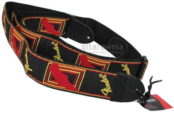 Pasek gitarowy amerykańskiej marki Fender, model MONOGRAMMED B-Y-R. Pasek można stosować do gitar elektrycznych, basowych i akustycznych. Posiada sznurek umożliwiający zawiązanie na główce w gitarach akustycznych, nie posiadających drugiego zaczepu. Kolorystyka tego modelu to połączenie czerni, żółtego i brązu. Pasek jest bardzo wytrzymały i wyposażony w specjalną, miękką warstwę po stronie przylegającej do ciała.