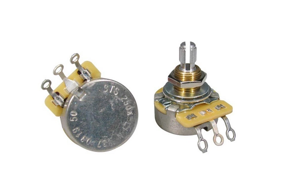 Potencjometr 250 kOhm, liniowy. Stosowany jako potencjometr barwy tonu w gitarach z przetwornikami jednocewkowymi. Wysokość gwintu 9 mm. Średnica gwintu 9,4 mm. Średnica puszki 24 mm. wysokość trzpienia 18 mm. Średnica trzpienia 6,13 mm.