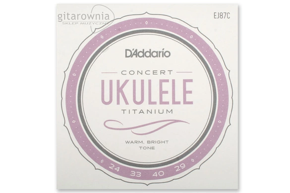 - D'addario Titanium Concert struny do ukulele. Wykonane z gęstego materiału monofilament, który ma atrakcyjnie przezroczysto-fioletowy odcień i połysk, gładki, podobny do nylonu.