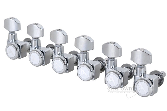 Zestaw oryginalnych chromowanych kluczy blokowanych marki Fender®. Przełożenie 18:1. Chromowane. Układ - 6 w linii. Klucze od strun wiolinowych posiadają niższe trzpienie (kołki).