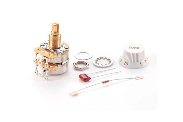Popularny patent Fender'a - TBX Tone Control. Regulacja barwy zarówno w zakresie wysokich jak i niskich częstotliwości zamiennie. Do połowy działa jak klasyczny pot barwy tonu. Od połowy obcina niskie pasmo, bez ingerencji w wysokie.Montażowe nakrętki, podkładki, gałka potencjometru i 0,1 mf kondensator 250V w zestawie.