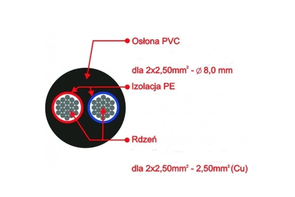 Producent zastosował izolację PE rdzenia oraz izolację PVC dla całego przewodu.