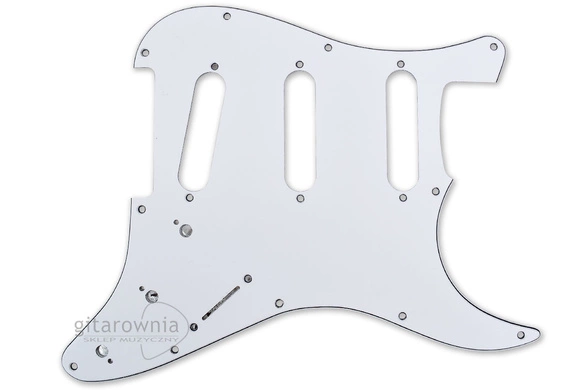 Maskownica S-S-S /WH - Biała, trójwarstwowa płytka do gitar z układem przystawek S-S-S (3 x Single Coil ). Z tyłu posiada aluminiowy ekran pod układ elektryczny.
