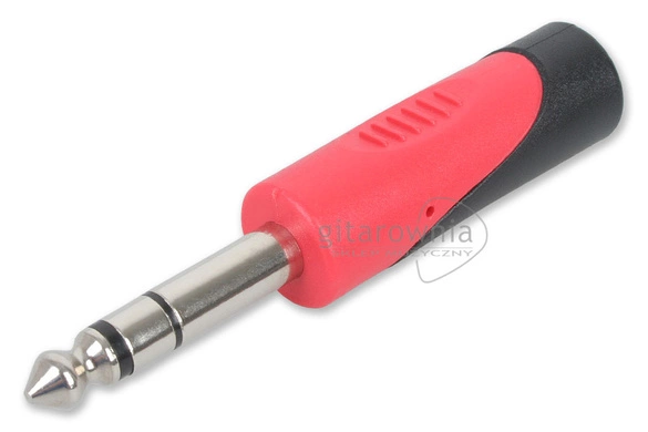 Redukcja (adapter, przelotka) firmy Roxtone. Jack 6.3 mm stereo wtyk - Jack 3.5 mm stereo gniazdo.