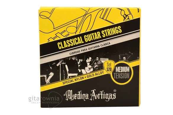 Komplet strun do gitary klasycznej. Wyprodukowane w Argentynie przez Medina Artigas przy użyciu wysokiej jakości materiałów, specjalny nylon zapewnia znakomitą intonację a złocony oplot świetne bassy. Naciąg: Medium.