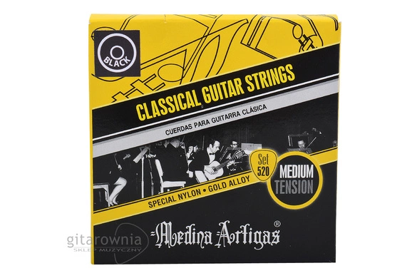 Komplet strun do gitary klasycznej. Wyprodukowane w Argentynie prze Medina Artigas przy użyciu wysokiej jakości materiałów, specjalny nylon zapewnia znakomitą intonację a złocony oplot świetne bassy. Naciąg: Medium. Czarny Nylon.