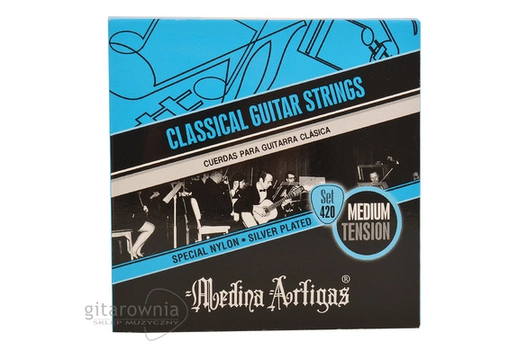 Komplet strun do gitary klasycznej. Wyprodukowane w Argentynie prze Medina Artigas przy użyciu wysokiej jakości materiałów, specjalny nylon zapewnia znakomitą intonację a posrebrzany oplot świetne bassy. Naciąg: Medium.