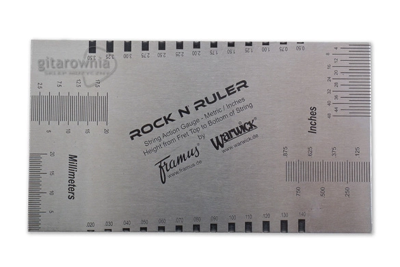 Uniwersalne narzędzie do mierzenia akcji strun gitary elektrycznej, akustycznej oraz basowej. Skale podane są zarówno w calach jak i jednostkach metrycznych. Tylna strona zawiera informacje o prawidłowej wysokości strun. Przy pomocy tego prostego narzędzia możemy optymalnie ustawić odległość strun od progów w swoim instrumencie.