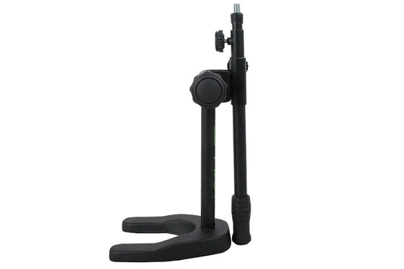 Bardzo stabilny statyw mikrofonowy stołowy, krótki, osadzony na solidnej podstawie.