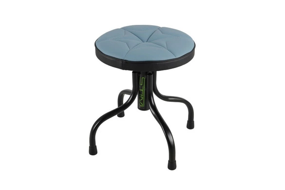 Wygodny taboret / stołek posiadający regulację wysokości poprzez kręcenie siedziskiem. Stelaż wykonany został z metalowych rur pokrytych bez połyskowym lakierem w kolorze czarnym. 4 odpowiedniej grubości rurki, na których spoczywa siedzisko, zakończone zostały gumami anty-poślizgowymi zapewniającymi stabilność całości. Regulacja wysokości posiada blokadę w postaci dużej śruby z wygodnym uchwytem. Siedzisko w kolorze niebieskim, obszyte zostało wytrzymałym materiałem skóropodobnym, na którym przeszycia tworzą motyw gwiazdy. Wewnątrz znajduje się miękka gąbka, która zapewnia odpowiedni komfort w czasie gry.