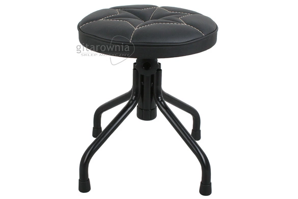 Wygodny taboret / stołek posiadający regulację wysokości poprzez kręcenie siedziskiem. Stelaż wykonany został z metalowych rur pokrytych bez połyskowym lakierem w kolorze czarnym. 4 odpowiedniej grubości rurki, na których spoczywa siedzisko, zakończone zostały gumami anty-poślizgowymi zapewniającymi stabilność całości. Regulacja wysokości posiada blokadę w postaci dużej śruby z wygodnym uchwytem. Siedzisko w kolorze czarnym, obszyte zostało wytrzymałym materiałem skóropodobnym, na którym przeszycia tworzą motyw gwiazdy. Wewnątrz znajduje się miękka gąbka, która zapewnia odpowiedni komfort w czasie gry.