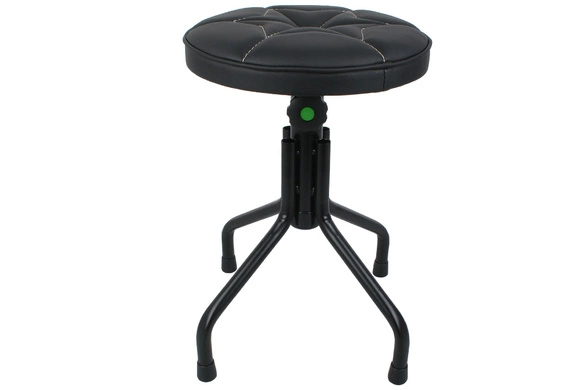 Wygodny taboret / stołek posiadający regulację wysokości. Stelaż wykonany został z metalowych rur pokrytych bez połyskowym lakierem w kolorze czarnym. 4 odpowiedniej grubości rurki, na których spoczywa siedzisko, zakończone zostały gumami anty-poślizgowymi zapewniającymi stabilność całości. Regulacja wysokości posiada blokadę w postaci dużej śruby z wygodnym uchwytem. Siedzisko w kolorze czarnym, obszyte zostało wytrzymałym materiałem skóropodobnym, na którym przeszycia tworzą motyw gwiazdy. Wewnątrz znajduje się miękka gąbka, która zapewnia odpowiedni komfort w czasie gry.